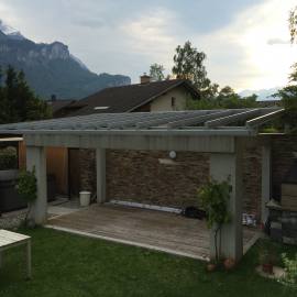 Unter oder über dem Glas montiert zähmt die Store Typ ANCONA zu grelle Sonne und Hitze und zaubert ein wohnliches Licht auf die Terrasse.